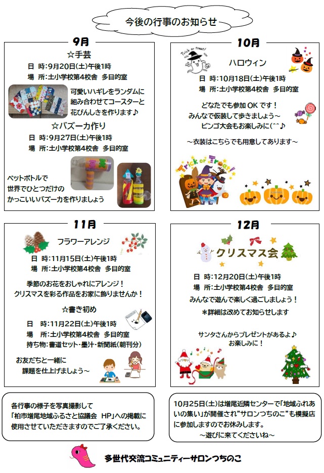 <ハロウィンパーティー> 10月18日(土)サロンつちのこの少し早めのハロウィンパーティーが行われました。朝から少し暑いくらいの秋晴れの日、子供35名、大人10名、先生2名計47名の参加がありました。 仮装した子どもたちが「トリック・オア・トリート」の言葉を言いながら近所を歩いてお菓子をいただき、最後はビンゴ大会で大盛り上がりでした。 次回は11月15日(土)13時から「フラワーアレンジ」です。 素敵に作ってクリスマスに飾りましょう。 ※行事の様子は、こちらでご覧下さい。 |